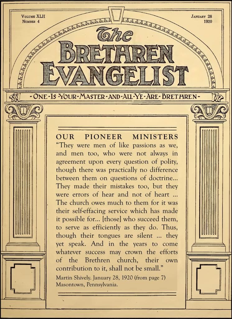 28 de enero de 1920. Hay ciertos hombres que destacan por encima del resto en la mente de la iglesia como merecedores de honor. Son los hombres que abrieron el camino para la iglesia de Los Hermanos [Confraternidad de Charis] como una denominación separada y distinta. Son los ministros pioneros de la iglesia, los hombres que se abrieron camino solos por las montañas, a través de los bosques y las praderas para predicar el sencillo Evangelio de Jesucristo sin añadidos ni sustracciones y para formar pequeños grupos de santos adoradores en cada comunidad a la que llegaban. Son los hombres que fundaron la denominación, que no defiende la promoción de un nuevo «ismo» o credo, sino la restauración y propagación del Evangelio original y las prácticas de la iglesia primitiva. Eran hombres nobles, temerosos de Dios, que se oponían a las exigencias y prohibiciones humanas con el mismo fervor con que amaban la ley de Dios. Eran hombres que Dios provee como iniciadores de grandes movimientos; hombres en quienes ciertas virtudes desafiantes se manifestaban con especial intensidad.
